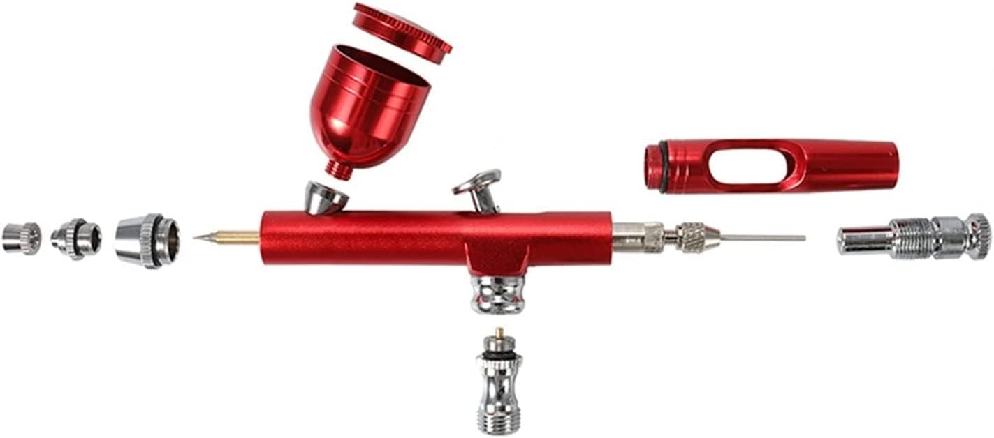 0.3mm needle nozzle, broad spray, action trigger for easy and accurate spray.Action gravity feed airbrush for fine art, nail art, temporary tattoo, cake decorating, hobbies etc.Made of fine quality material, convenient to use.Easy fluid refills and easy cleaning.Professional action gravity feed airbrush kit for hobby paint craft.Airbrush for model making, cake decorations, draw the outline of camouflage,tattoos nail art, etc.Saving much more time than handmade drawing and excellent for your spray painting business.Action trigger design saves raw materials and practical.Widely used by the general model enthusiasts.Specifications:Paint feeding mode: Gravity feedingCaliber of nozzle: 0.3mmLength of spray pen: 150 mmWorking air pressure: 15 - 50 PSIOn/ off mode: Dual-Action Trigger controlCapacity of jar: 7 CCNote:1. Please test the pen with water first.2. Please do not use thick pigments, which will affect the effect of ejection.3. Wash the inside of the spray pen according to the steps in the manual after use.4. Install the spray pencil after cleaning.Kindly Note:This beauty special air compressorcan use for makeup, beauty, nail, temporary tattoos, cake decorating, low dense degree of dye, etc.and shall not be used for spraying thick paint.Please receive airbrush after debugging to the best state, and then use a clean water test, atomization is no
