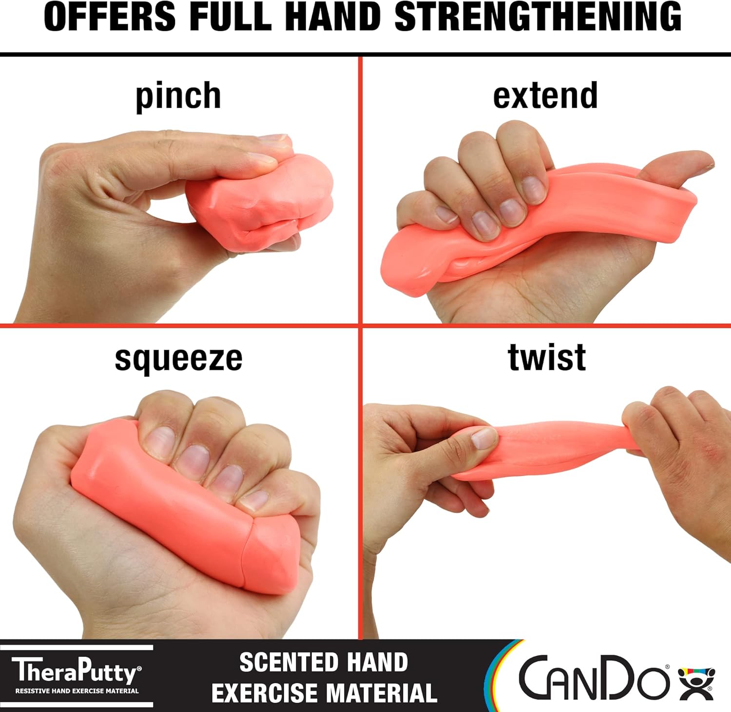 • Made From Premium Materials – Pull, twist and squeeze the aromatic putty without worry! CanDo TheraPutty is the industry standard in resistive hand exercise putty. It’s non-toxic and latex, gluten, and casein free–and it won’t dry out over time!