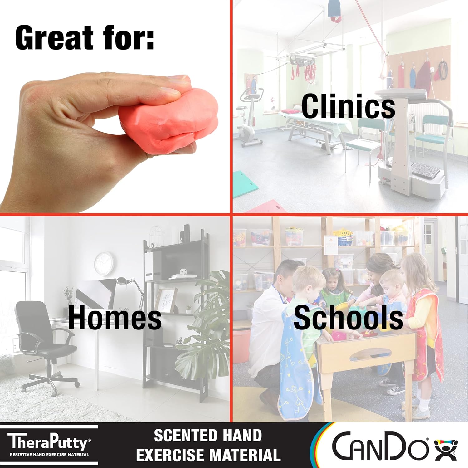 Product Description CanDo TheraPutty Scented Exercise Putty awakens the senses to keep children or those with sensory issues alert and make therapy sessions more pleasant. Available in 4 scents, each with its own unique color and resistance. Tan (vanilla) is xx-light, yellow (banana) is x-light, red (cherry) is light, and green (apple) is medium. Using scented putty is a fun way for children or those with sensory issues to develop grip strength, stay attentive and participate.Squeeze, pinch, stretch or twist the scented putty using a variety of different finger, hand and wrist resistive exercises to strengthen hand muscles, improve fine motor skills, and decrease stress. Just a few groups this product is ideal for include: physical and occupational therapists, children, and those with senory issues. Available in a convenient, easy-to-open plastic container (2 ounce) for individual patients to use at home and a choice of larger containers (1 and 5 pound) for the hospital or clinic. CanDo TheraPutty Scented Exercise Putty material is gluten, latex and casein free. Manufacturer Contact Information 18004312830