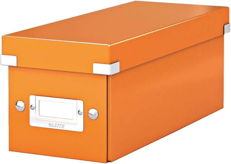 Product Description Leitz Wow Click and Store DVD Storage boxes are designed for storing DVDs and other odds and ends. They have a capacity of 20 standard cases or 40 slim case DVDs. The enhanced design and colours will enhance your office and home space and they are collapsible for saving space for storage when not in use. Assembly is quick and easy with the press button system and there is a high class silver label holder with label for easy content indexing. They are made from strong board with a laminated, gloss polypropylene wipe clean surface for better protection and finish. Available in a variety of colours and in three sizes of storage box, drawer cabinet and CD storage box. Set Contains: 1 x Dvd Storage Box