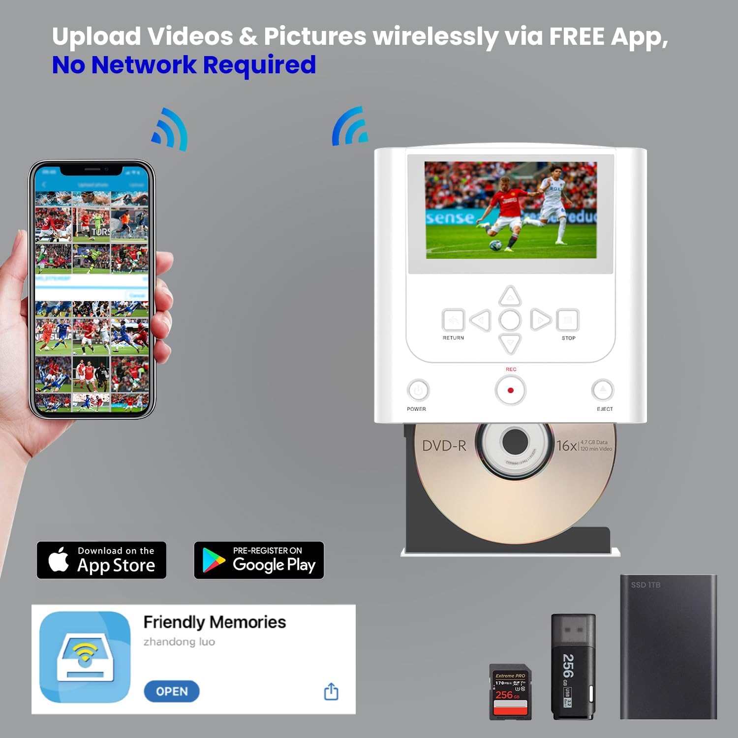 | Other Special Features of the Product | Burn to DVD±R/RW or Save Digital Copies to USB/SD, HDMI IN/OUT + AV (RCA) IN — Connect VCR/VHS/Hi8/Camcorders, No Computer Needed — Record to DVD or Save to USB/SD, Phone App Transfer (iOS/Android) — Copy Photos/Videos to USB/SD/DVD, Playback & Preview — on 4.3" Screen or HDMI to TV |